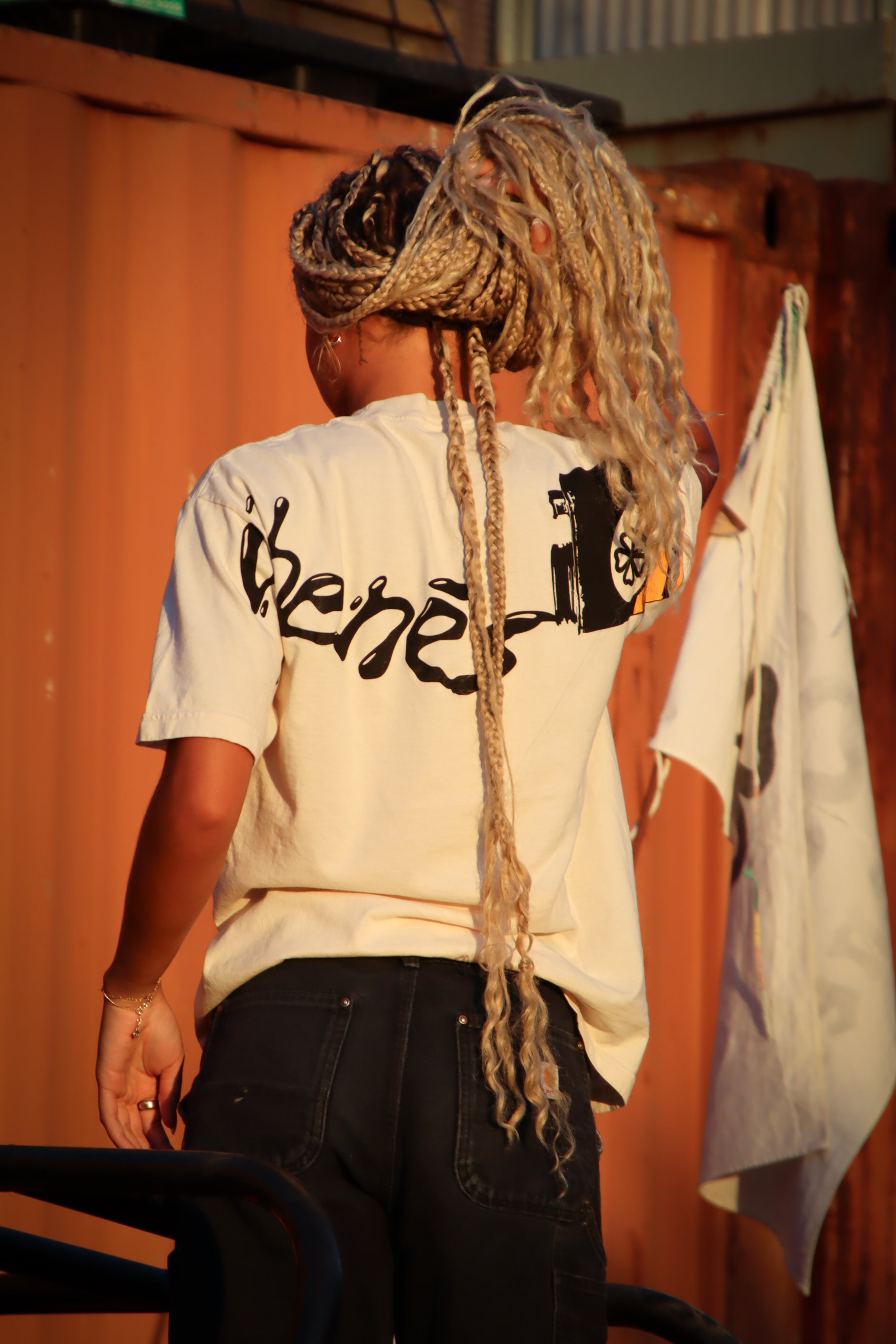 Heavy weight 100% cotton T shirt milled, sewn, and printed all in California. Available in 5 sizes for the perfect fit. Drop sleeve construction paired with a high neck gives the garment a very sturdy and well put together look paired beautify with its 2 color screen printed graphic on the front and back!